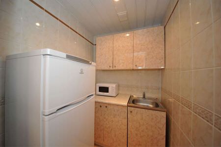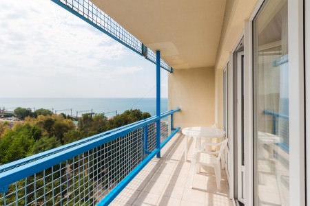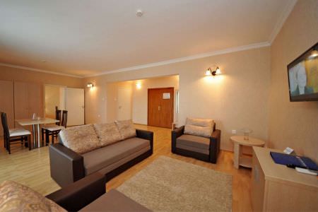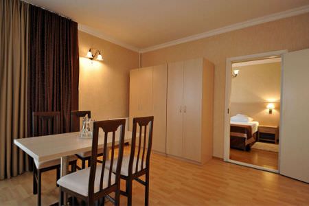 Апартаменты с кухней походят для проживания 2-3 гостей. Этот просторный номер имеет интерьер в бежевых тонах и приятное освещение. Имеется выход на лоджию.