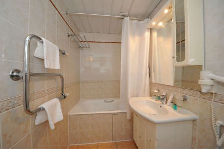 В санузле имеются ванна, туалет, раковина и фен.